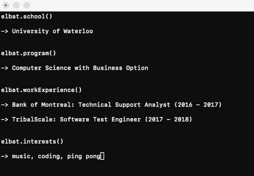 I'm currently in my 4b term at the University of Waterloo, working on a Bachelor's degree in Computer Science with a Business Option. Recently I've been working on a react-native app to help reduce wait times in urgent care clinics. I've done a few internships in web development, mainly using React, Redux and Node.js.When I'm not coding, I enjoy playing piano and writing.